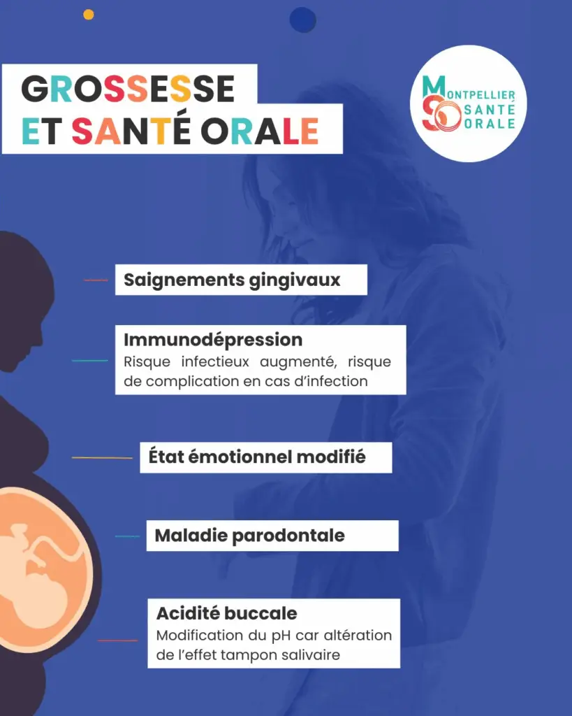 Les pathologies bucco-dentaires chez la femme enceinte sont celles que l’on retrouve dans la population générale mais elles peuvent être accentuées par les modifications physiologiques (hormonales, salivaires, bactériennes, immunologiques) et peuvent aussi avoir des conséquences sur l’enfant à naître.